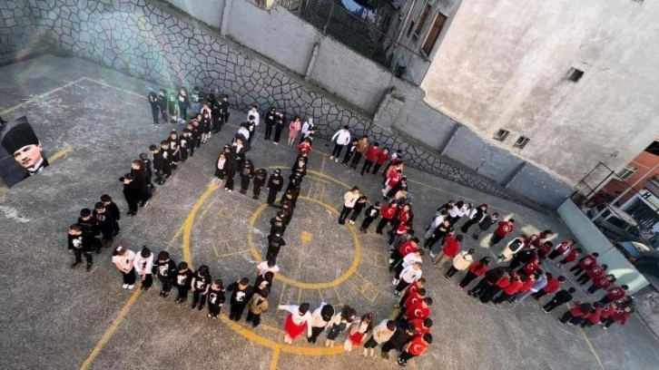 Okul bahçesinde gerçekleştirilen 10 Kasım etkinliklerinin ardından öğretmenlerin desteğiyle ‘1938’ yazılı bir koreografi oluşturan 180 öğrenci izleyenlerin beğenisi kazandı.