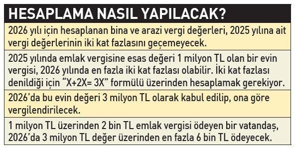1 milyon TL üzerinden 2 bin TL emlak vergisi ödeyen bir vatandaş, 2026'da 3 milyon TL değer üzerinden en fazla 6 bin TL ödeyecek. Üst sınır getirilmeseydi, ev sahibi olan vatandaş 5 milyon TL olarak belirlenen evin değeri üzerinden 10 bin TL'lik vergi ödemek durumunda kalacaktı.