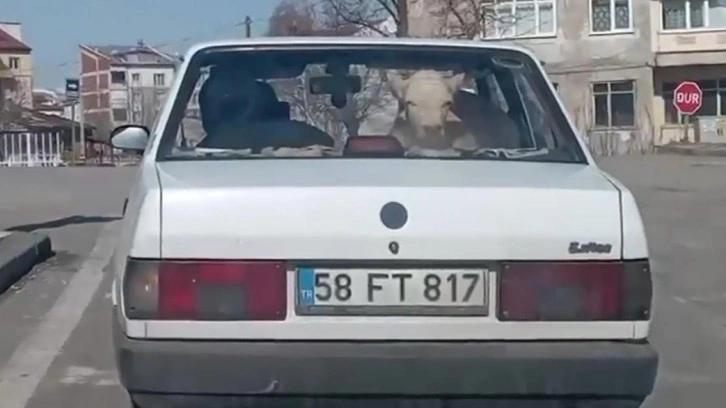 Kent merkezinde trafikte seyir halindeki bir otomobilin arka kısmında taşınan buzağıyı görenler, o anları, cep telefonuyla görüntüledi.