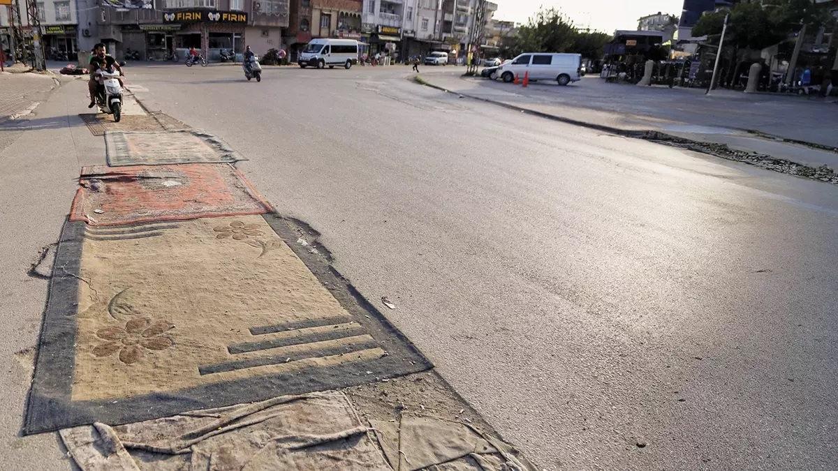 Adana Büyükşehir Belediyesi tarafından bölgede başlatılan asfalt çalışmalarının tamamlanması nedeniyle mahalle sakinleri çözümü yollara halı sermekte buldu.