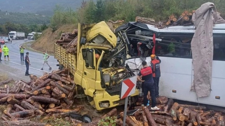 Kazada otobüs ve kamyon sürücüleri hayatını kaybetti, 21 kişi de yaralandı. Araçların kullanılamaz hale geldiği kazada kamyondaki tomruklar da yola saçıldı.