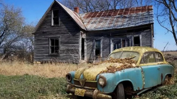 Bu fotoğraf, eski bir bina ve paslanmış bir araba ile ön plana çıkıyor. Kasvetli ağaçlar ve güneşli bir sonbahar günü atmosferi, gözünüzü alabilecek diğer detaylar arasında. Ancak bu fotoğrafta, sadece dikkatli gözlerin hemen fark edebileceği bir detay daha var: bir tilki.