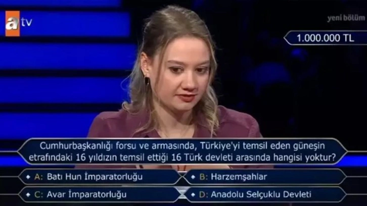 ATV'de yayınlanan Kim Milyoner Olmak İster adlı bilgi yarışmasında 1 milyon TL değerindeki "Cumhurbaşkanlığı Forsu ve Armasında, Türkiye'yi temsil eden güneşin etrafındaki 16 yıldızın temsil ettiği 16 Türk devleti arasında hangisi yoktur?" sorunun cevabı merak ediliyor.