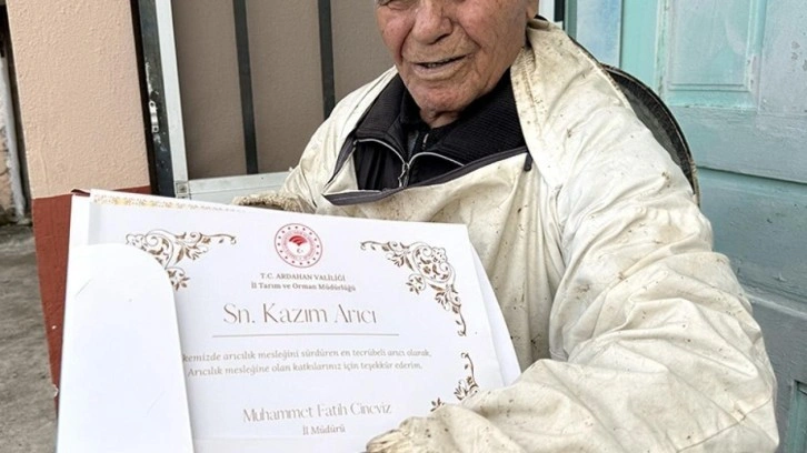 Ardahan'da oturan 101 yaşındaki emekli öğretmen Kazım Arıcı, ilerlemiş yaşına rağmen 69 yıldır arıcılığı sürdürüyor.