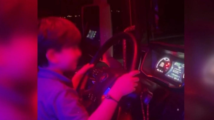 Bursa-Ankara kara yolunda gece saatlerinde kaydedilen görüntülerde, ayakları pedallara güçlükle ulaşan Ç.K.’nın tır ile ilerlerken, babasına poz verdiği görüldü.