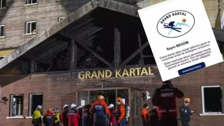 Türkiye, yangın faciasında yaşamını yitirenlere ağlarken; skandal bir gelişme yaşandı. 78 kişiye mezar olan Grand Kartal Otel'in müşterilerine bir değerlendirme mesajı gönderdi. "Bizi değerlendirmek ister misiniz? Grand Kartal Hotel" mesajında, "Grand Kartal olarak tatilinizin güzel ve unutulmaz anılar ile dolduğunu umuyoruz. Sizleri aramızda tekrar görmekten büyük memnuniyet duyarız. Eve dönüşünüzün güvenli ve sorunsuz olması dileğiyle" ifadeleri 'pes' dedirtti.