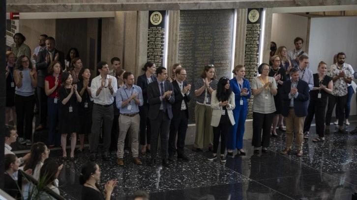 Dışişleri Bakanlığı binası lobisinde ve kapı önünde toplanan personel, binayı ellerinde taşıdıkları kişisel eşyalarıyla terk eden arkadaşlarını alkışlayarak teselli etti.