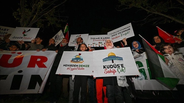 Ankara Filistin Dayanışma Platformu üyeleri, ABD'nin Ankara Büyükelçiliği önünde ellerinde "Gazze'de soykırım yaşanıyor" ve "Nehirden deniz özgür Filistin" yazılı dövizlerle toplandı.