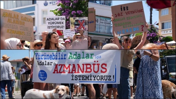 Düdük çalarak İBB'yi protesto eden gruptakiler, "Yürünebilir Adalar için azmanbüs istemiyoruz", "Adalar'da yürümek istiyoruz", "16 milyon için direniyoruz", "Ada'da azmanbüs yasa dışı", "Ne akülü ne azmanbüs Ada" yazılı pankartlar taşıdı.