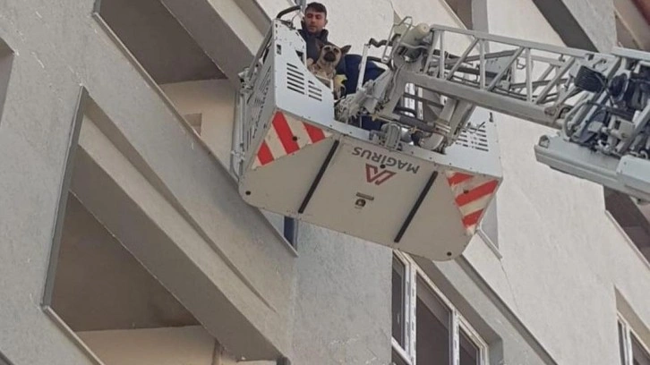 Dış cepheden uzatılan merdivenle dairenin balkon kısmına ulaşan ekipler, köpeği bulunduğu yerden kurtardı.
