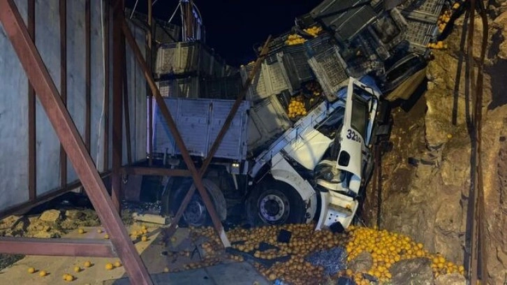 Alanya'da 53 yaşındaki Cemal Uğur idaresindeki portakal yüklü kamyon, Oba Mahallesi'ndeki yolda sürücüsünün direksiyon hakimiyetini kaybetmesiyle refüjü aşarak duvara çarptı.