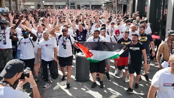 Takımlarını desteklemek için Almanya'ya giden PSG taraftarları Filistin bayraklarıyla yürüyerek İsrail'in Gazze'ye yönelik saldırılarını protesto etti.