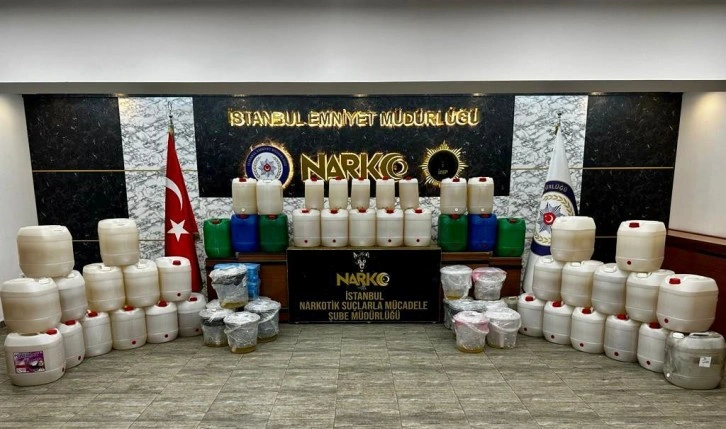 2 adet şeffaf plastik saklama kabı içerisinde uyuşturucu veya uyarıcı madde olan daralı ağırlığı 7 Kilo 400 gram gelen katı reçine halde metamfetamin, 13 parça şeffaf kova içerisinde daralı ağırlığı sıvı 34 kilo 600 gram gelen metamfetamin, 46 parça bidonlar içerisinde, daralı ağırlığı 1 Ton 195 kilo 100 gram gelen sıvı halde Metamfetamin maddesi olmak üzere toplamda 1 ton 237 kilo metamfetamin ele geçirilmiş oldu. Şüphelilerin işlemleri sürüyor.