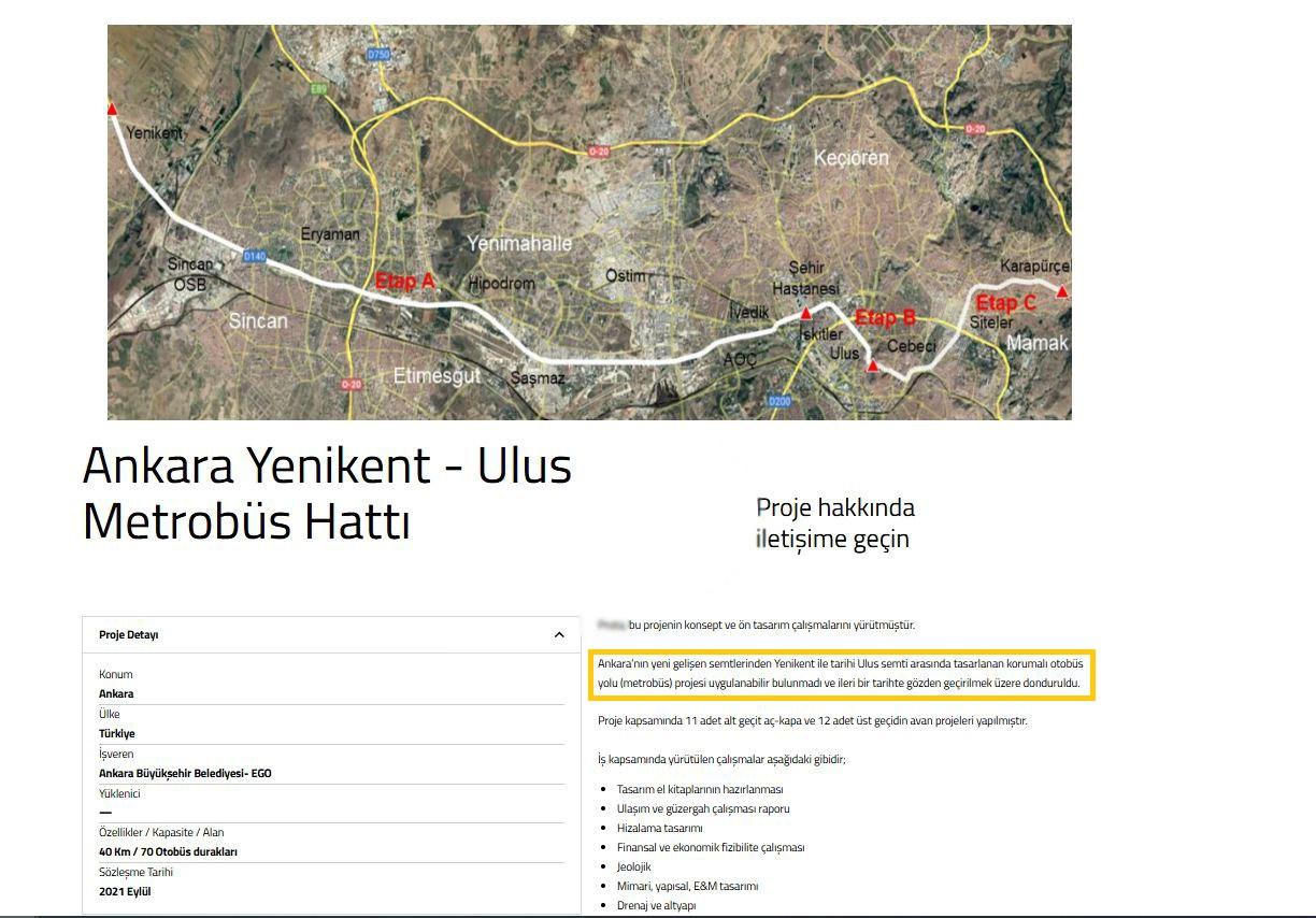 Projeye dair firma, “Ankara’nın yeni gelişen semtlerinden Yenikent ile tarihi Ulus semti arasında tasarlanan korumalı otobüs yolu (metrobüs) projesi uygulanabilir bulunmadı ve ileri bir tarihte gözden geçirilmek üzere donduruldu” ifadelerine yer verildi.