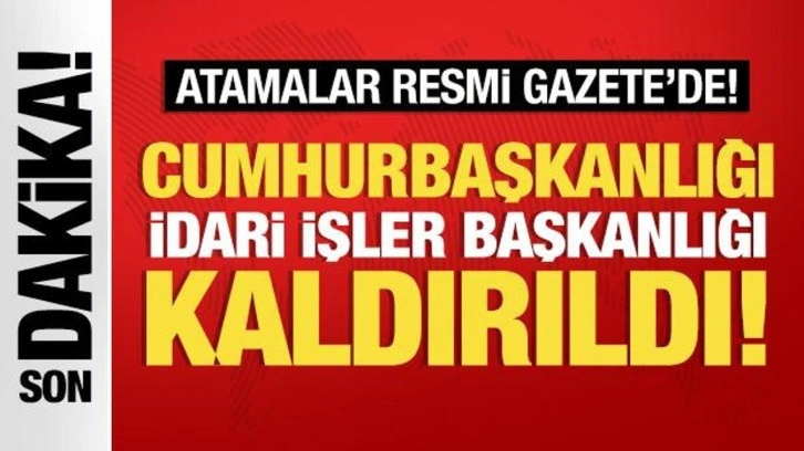 SON DAKİKA: Resmi Gazete'de yayımlanan Cumhurbaşkanlığı Kararnamesine göre, Cumhurbaşkanlığı İdari İşler Başkanlığı kaldırıldı. Cumhurbaşkanlığı Genel Sekreterliği oluşturuldu.