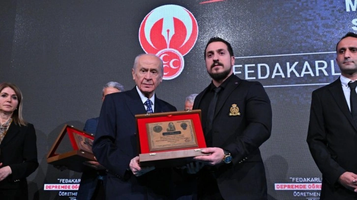 Program sonunda MHP Genel Başkanı Bahçeli, deprem bölgesindeki özverili çalışmaları nedeniyle öğretmenlere hediye plaketleri verdi. Gözyaşlarına hakim olamayan bir öğretmene plaket veren Bahçeli'nin de gözleri doldu.
