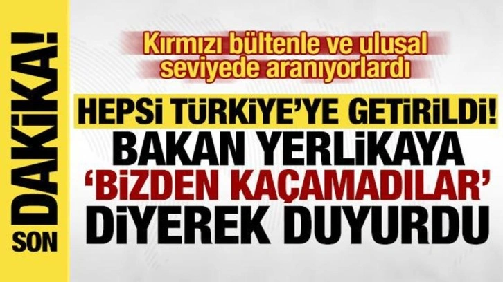 Bakan Yerlikaya, 'Bizden kaçamadılar' sözleriyle; Bulgaristan, Polonya, Gürcistan, Almanya, KKTC ve Lübnan'dan aranan şahısların Türkiye'ye getirildiğini açıkladı.