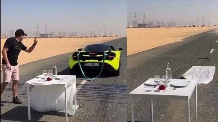 Araç sürücüsü aniden kalkarak kısa sürede yüksek bir hıza ulaştı. O esnada ip yavaş yavaş kısalırken sona gelindi ve bağlı olduğu masa örtüsünü aniden masa üstünden çekti. O görüntülerde masa örtüsü kolaylıkla çekilirken, üzerindeki hiçbir şey devrilmedi. Tabağın kırılması ve şişenin düşmesi beklenirken, içi su dolu bardaktan bir damla su bile masaya sıçramadı. O anlar sosyal medyada gündem oldu.