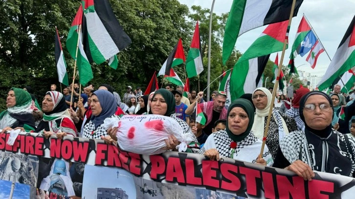 Almanya'yı İsrail'e verdiği destek nedeniyle eleştiren göstericiler, "Almanya finanse ediyor İsrail bombalıyor", "Soykırımı durdurun", "Gazze'nin işgaline hayır" yazılı döviz ve pankartlar taşıdı.