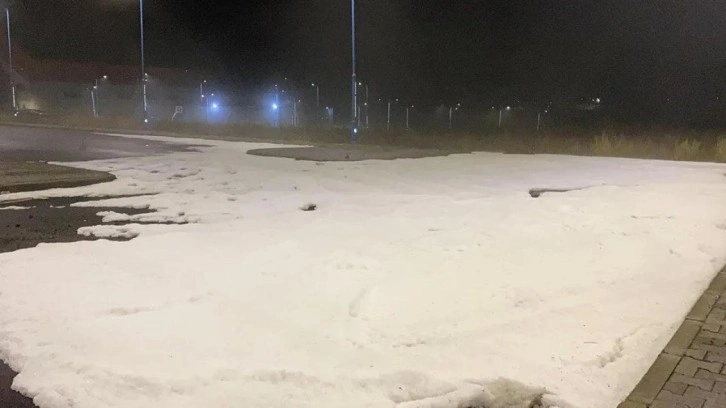 Ardahan'da akşam saatlerinde etkili olan şiddetli dolu, Ardahan- Kars karayolunu beyaza bürüdü.