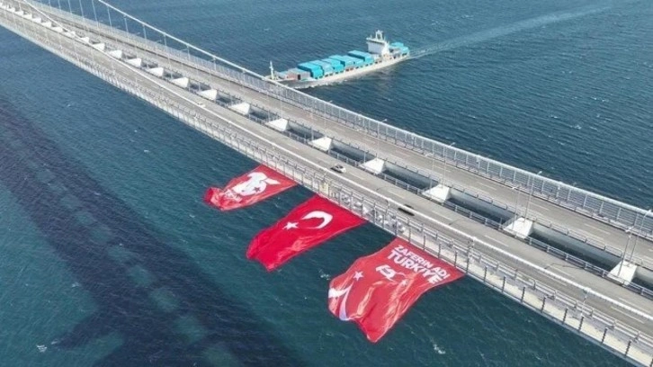 Çanakkale Valiliğinin sosyal medya hesabından yapılan paylaşımda, 1915 Çanakkale Köprüsü'nde Türk bayrağını gururla dalgalandırdığı belirtildi.