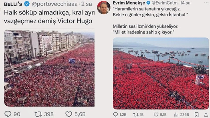 CHP üyesi Evrim Menekşe ve diğer birçok hesabın, CHP İzmir mitingi diye paylaştığı görsellerin AK Parti İzmir mitingine ait olduğu ortaya çıktı. Paylaşılan görsellerde Cumhurbaşkanı Erdoğan ve Devlet Bahçeli'nin resimleri yer alıyor.