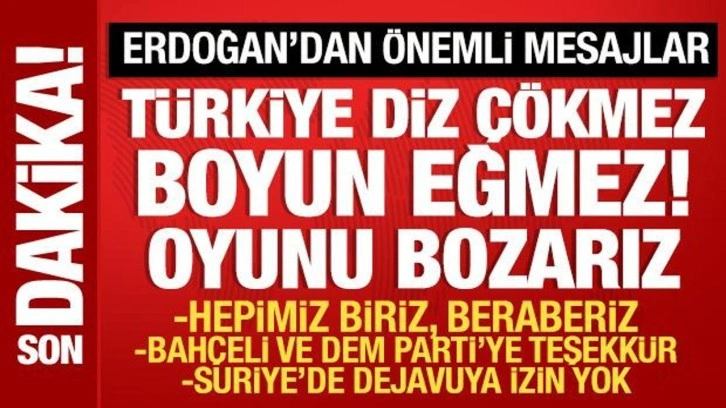 Buradan Meclis kürsüsünden tekrar ifade etmek isterim: Türkiye Cumhuriyeti Devleti hiçbir dünyevi güç karşısında diz çökmez, boyun eğmez, taviz vermez ve egemenliğini asla pazarlık konusu yapmaz.