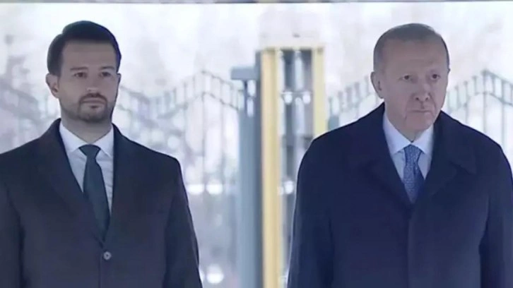 Erdoğan ve Milatoviç, merdivenlerde Türkiye ve Karadağ bayrakları önünde tokalaşarak basın mensuplarına poz verdi.
