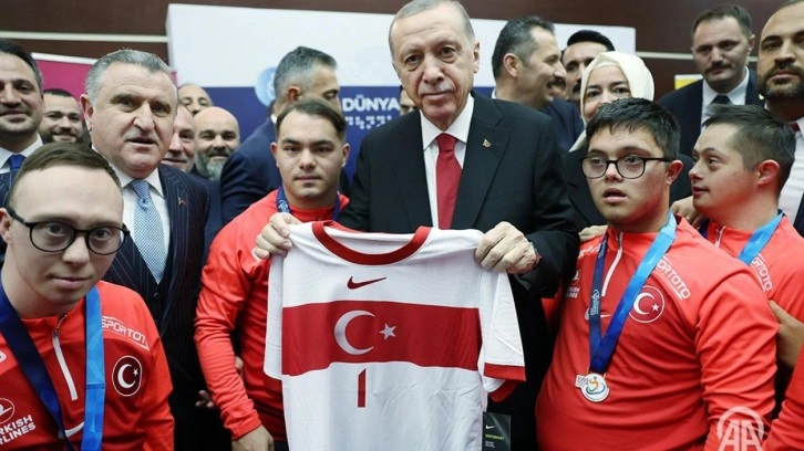 Erdoğan, parti genel merkezindeki kabulde, down sendromlu şampiyon sporcularla sohbet etti, hatıra fotoğrafı çektirdi.