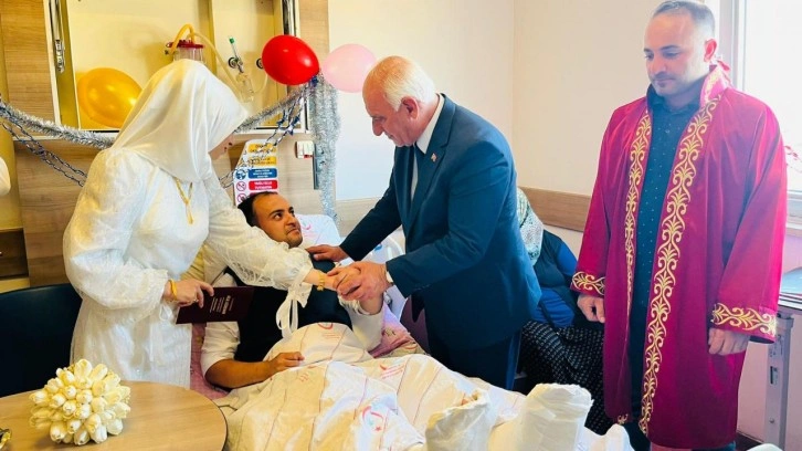Damat Selçuk Avcu da belediye başkanına mutluluklarına ortak oldukları için teşekkür ederek, “Göksun’da bir alışveriş merkezine gidip, birinci kata çıktık. Birinci katta bulunan boşluktan, yaklaşık 4 metre aşağıya zemin kata düştüm. Nikah ve düğünü ertelemek için nikahımızı hastane odasında kıydık. Bunu da hayra yoruyoruz” ifadelerini kullandı.