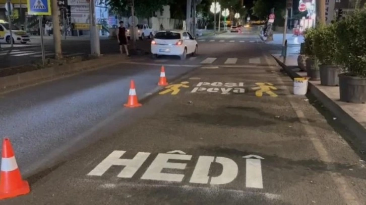 Ofis semtindeki Gevran Caddesi'ne, "önce yaya" anlamına gelen “Pêşî Peya" ve "yavaş" anlamına gelen “Hêdî" yazıları yazıldı.