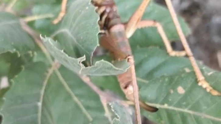 Diyarbakır’ın Silvan ilçesinde meşe ağacı yaprağında boyu 20 metreye kadar ulaşabilen dev etçil çekirge görüntülendi.