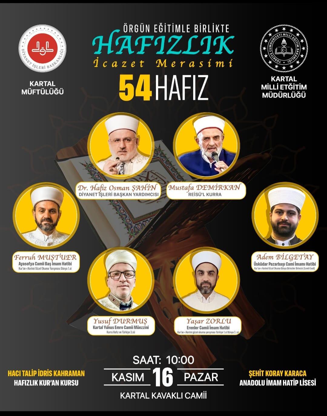 Kartal Müftülüğü ve Kartal Millî Eğitim Müdürlüğü işbirliğinde, örgün eğitimle birlikte hafızlık projesi kapsamında gerçekleştirilen bu tören, hafızlık müessesesinin toplumsal önemini bir kez daha gözler önüne serdi.