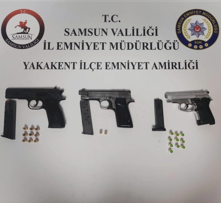 Samsun İl Emniyet Müdürlüğünce düğün ve benzeri merasimlerde kişilerin can güvenliğinin korunması, suç işlenmesinin önlenmesi, kamu düzeninin sağlanması çerçevesinde meskun mahallerde havaya ateş açılmasının önlenmesi, yaralama ve ölüm gibi istenmeyen olaylara meydan verilmemesi amacıyla tedbirler alınıyor. Bu kapsamda Yakakent ilçesinde gerçekleşen düğün merasiminde havaya ateş açtıkları tespit edilen N.K., E.K. ile N.S.B isimli şahıslar yakalanarak gözaltına alındı. Şahısların kullandıkları 1 adet 9 mm ruhsatsız tabanca, 1 adet 9 mm taşıma ruhsatlı tabanca, 1 adet kurusıkı tabanca, 11 adet 9 mm tabanca fişeği ve 10 adet kurusıkı tabanca fişeği ele geçirildi.