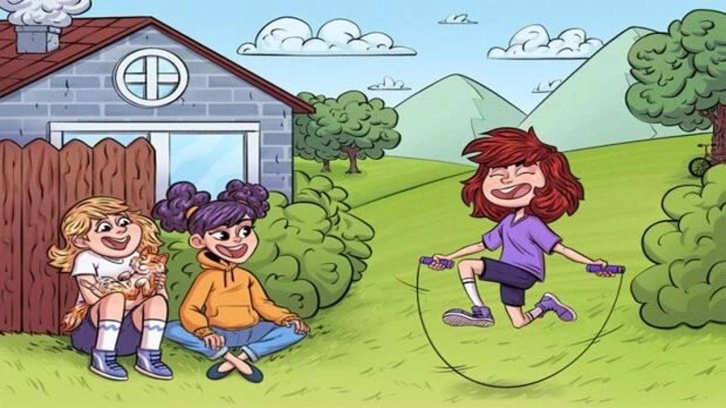 Yukarıda yer alan görselde 3 kız arkadaşın evlerinin arka bahçesinde eğlendiğini görüyorsunuz. Kızlardan bir tanesi ip atlıyor, biri ip atlayan arkadaşını izliyor. Bir tanesi de kucağında kedi seviyor. Bu eğlenceli optik yanılsama görselinde bir yerlerde ustalıkla saklanmış üç tane yüz ifadesi bulunuyor.
