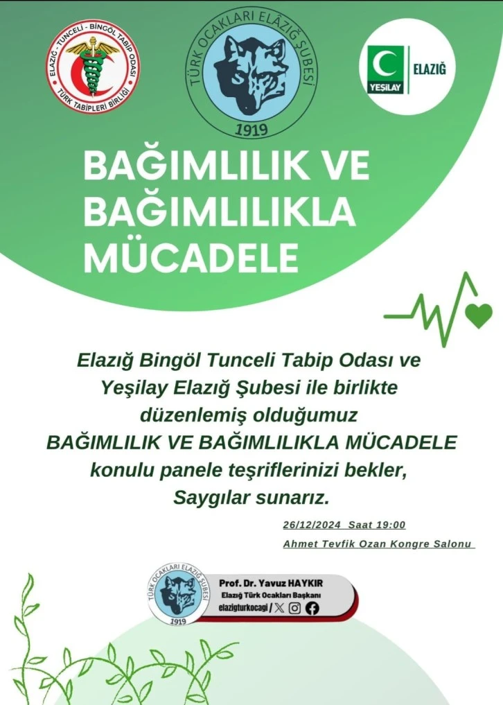 Elazığ Bingöl Tunceli Tabip Odası ve Yeşilay Elazığ Şubesi İle Birlikte Bağımlılık ve Bağımlılıkla Mücadele Konulu Panele Davetlisiniz.