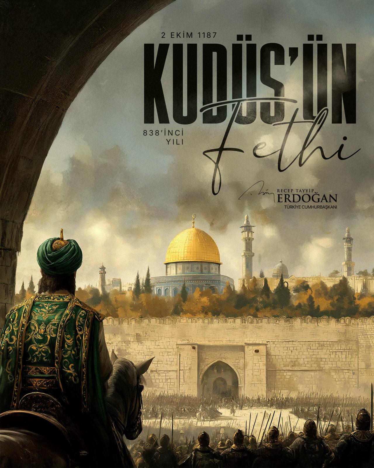 Cumhurbaşkanı Recep Tayyip Erdoğan, Kudüs'ün fethinin 838'inci yıl dönümünde, bu mukaddes şehrin ikinci fatihi Selahaddin Eyyubi ve kahraman askerlerini rahmetle yad ettiğini belirtti.