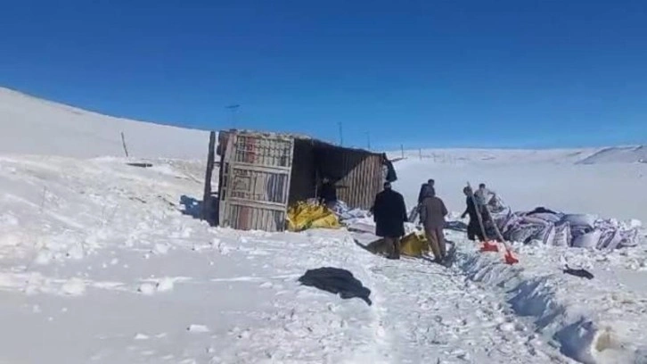 Bingöl'den Erzurum'un Tekman ilçesi Hamzanlar Mahallesi'ne yem götüren bir kamyon, karlı yolda devrildi.