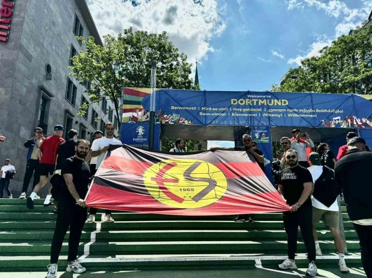 Türkiye-Portekiz maçını izlemek için Almanya’nın Dortmund kentine giden Eskişehirspor taraftarı, kent meydanında kırmızı-siyahlı bayraklarını açarak tüm dikkatleri üzerlerine topladı.