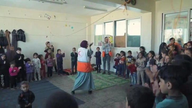 Filistin Kızılayı tarafından paylaşılan görüntüde, Gazzeli çocukların ekiplerle oyunlar oynadıkları, dans ettikleri ve çizim yaptıkları anlar yer aldı.