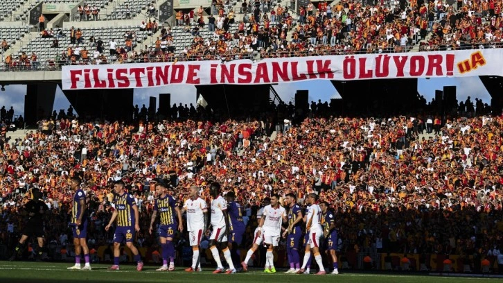 Galatasaray’ın dün Eyüpspor’la karşılaştığı müsabakada Atatürk Olimpiyat Stadı’na İsrail soykırımıyla ilgili iki dev pankart asıldı.