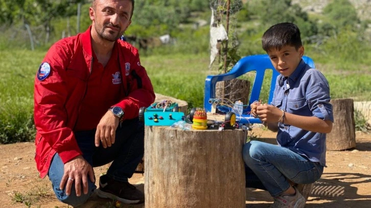 Derecik ilçesine bağlı Yeşilova köyünde ikamet eden 7. sınıf öğrencisi Aram Kaynak, çevresinden temin ettiği malzemelerle uzaktan kumandalı helikopter, araba, örümcek, akıllı soba maketleri yaptı.