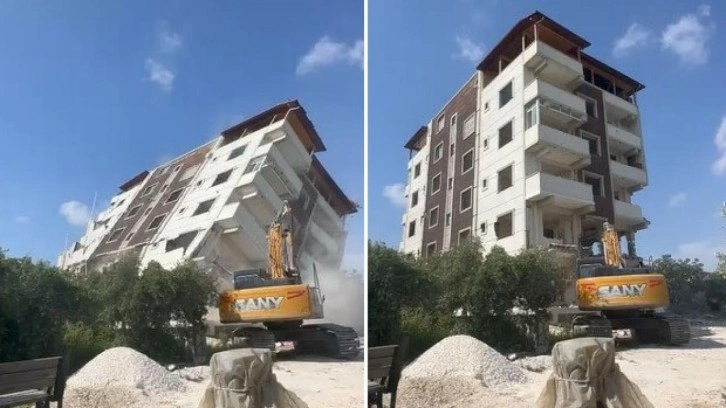 Kahramanmaraş merkezli depremlerde ağır hasar alan Hatay’da mahkeme süreci sona eren binaların yıkım ve enkaz kaldırma çalışmaları aralıksız sürüyor. Defne ilçesi Subaşı Mahallesi’nde bulunan 7 katlı bina, iş makinesinin darbesiyle yıkıldı. Binanın yıkılma anı ise kameralara anbean yansıdı. 7 katlı binanın yıkımı esnasında herhangi bir olumsuzluk yaşanmadı.