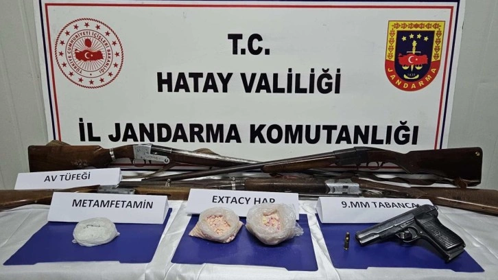 Ev ve eklentilerinde yapılan aramada, 2 bin uyuşturucu hap, 70 gram sentetik uyuşturucu, 4 av tüfeği ve 1 ruhsatsız tabanca ele geçirildi.