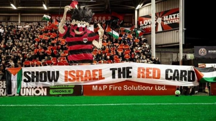 Soykırımcı İsrail'in Filistin'deki işgali ve Gazze ile Batı Şeria'daki saldırıları nedeniyle İskoçya ekibi Celtic'in 'Yeşil Tugay' (Green Brigade) taraftar grubunun başlattığı "İsrail'e kırmızı kart göster" çağrısına İrlanda'nın Bohemian takımı taraftarları da katıldı.