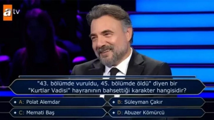 Kim Milyoner Olmak İster yarışmasında Kurtlar Vadisi ile ilgili sorulan sorunun cevabı internette araştırılıyor. Oktay Kaynarca'nın sunduğu ATV ekranlarında yayınlanan Kim Milyoner Olmak İster yarışmasındaki "43. bölümde vuruldu, 45. bölümde öldü" diyen bir 'Kurtlar Vadisi' hayranının bahsettiği karakter hangisidir? sorusunun cevabı belli oldu.