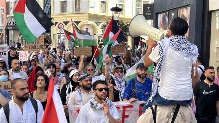 Filistin bayraklarının taşındığı gösteride, "Özgür Filistin", "Yazıklar olsun Rutte, Yazıklar olsun Wilders, elleriniz kanlı" ve "İsrail bombalıyor, Hollanda ödüyor" sloganları atıldı.