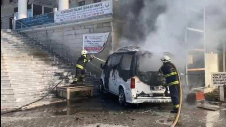 Tepebaşı ilçesi Fevziçakmak Mahallesi İlahiyat Camisi'nin bahçesinde park halinde bulunan Hazar Taştan’a ait 71 ADP 504 plakalı hafif ticari araç, hareket etti. Cami merdivenlerine çarpan araç, alev aldı.