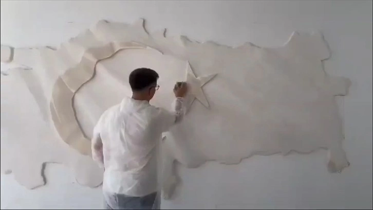 Bakanlığın sosyal medya hesabından, Jandarma Uzman Çavuş Mumcu'nun, duvara, Türk bayrağı renginde boyanmış Türkiye haritasını resmederken çekilen videosuna yer verildi.