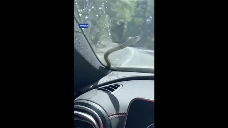Yaşadığı olayı cep telefonu kamerasıyla kaydeden sürücünün, "Arabamın camına yılan düştü. Şu an kafayı yiyeceğim. Yemin ediyorum bağıracağım, imdat" dediği anlar görüntülerde yer aldı.